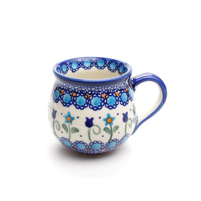 飲み口の下の部分がくびれて、膨らんだボディ。ポーランド食器の特徴的な形状で、最も人気のある形のマグカップです。毎日のお茶の時間におすすめのサイズで、ストレートで飲むコーヒーや紅茶にも丁度良いサイズです。